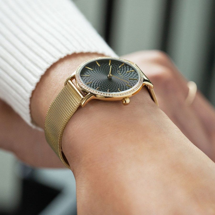 ساعت مچی زنانه کلاسیک نگین دار بند فلزی ، با ترکیب رنگ طلایی و مشکی - مناسب مجالس رسمی و فعالیت های روزمره