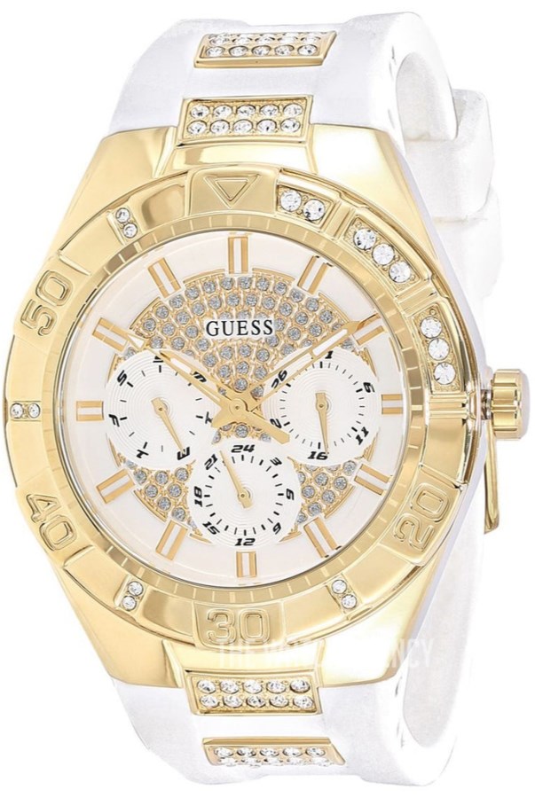 ساعت مچی زنانه نگین دار اسپرت بند پلاستیکی ، با ترکیب رنگ سفید و طلایی - مناسب فعالیت های ورزشی و روزمره