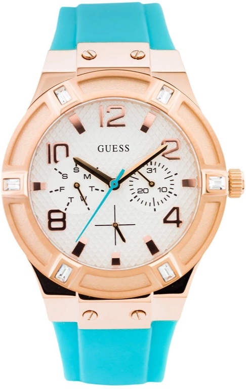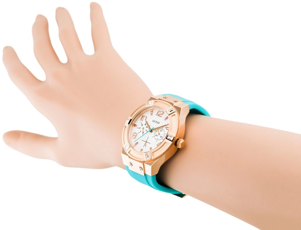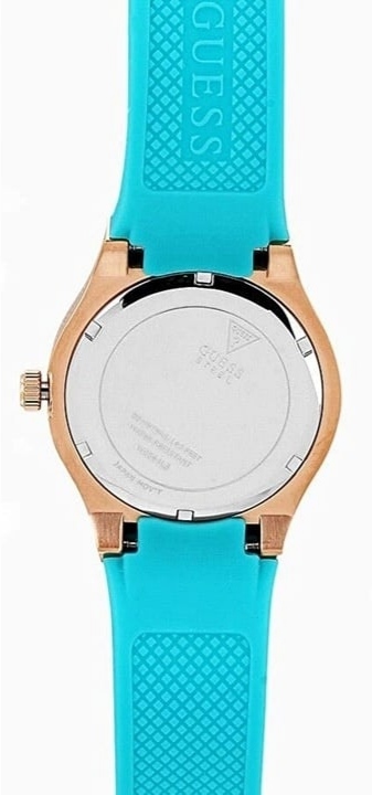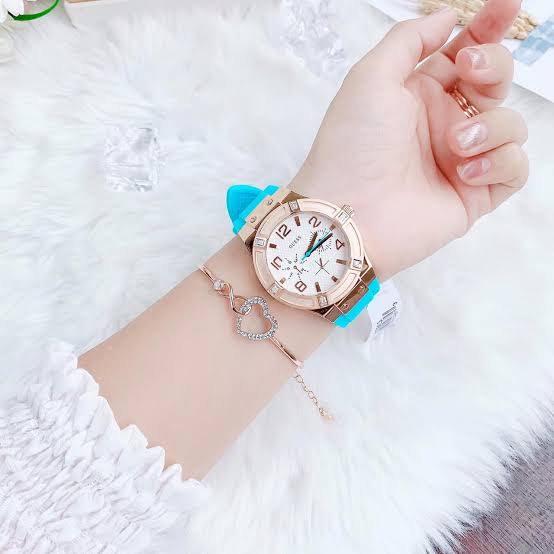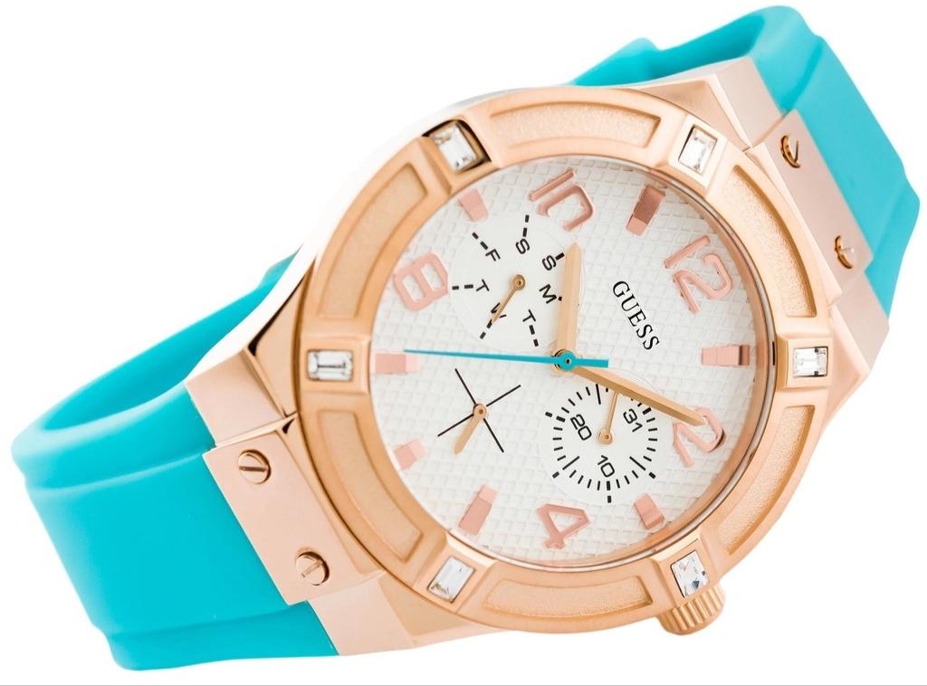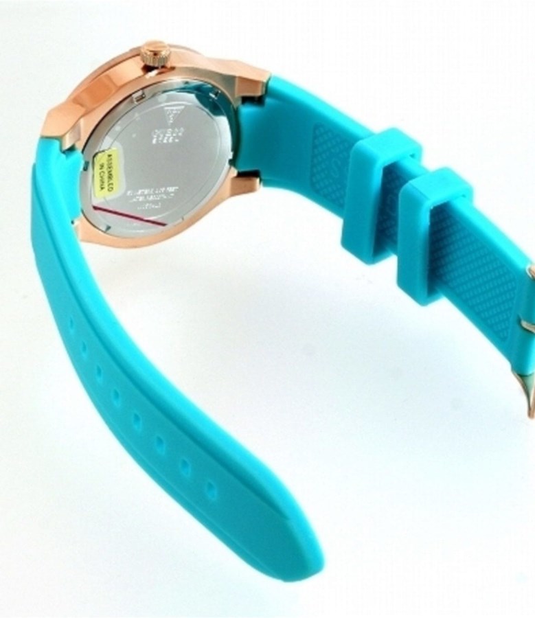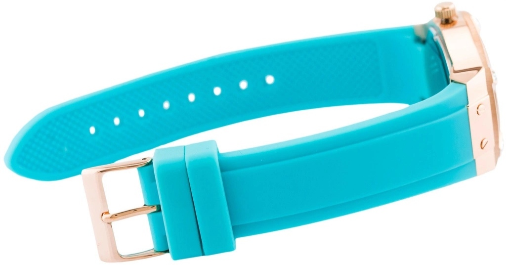 ساعت مچی زنانه نگین دار اسپرت بند پلاستیکی ، با ترکیب رنگ مسی،سفید و سبز آبی - مناسب فعالیت های ورزشی و روزمره