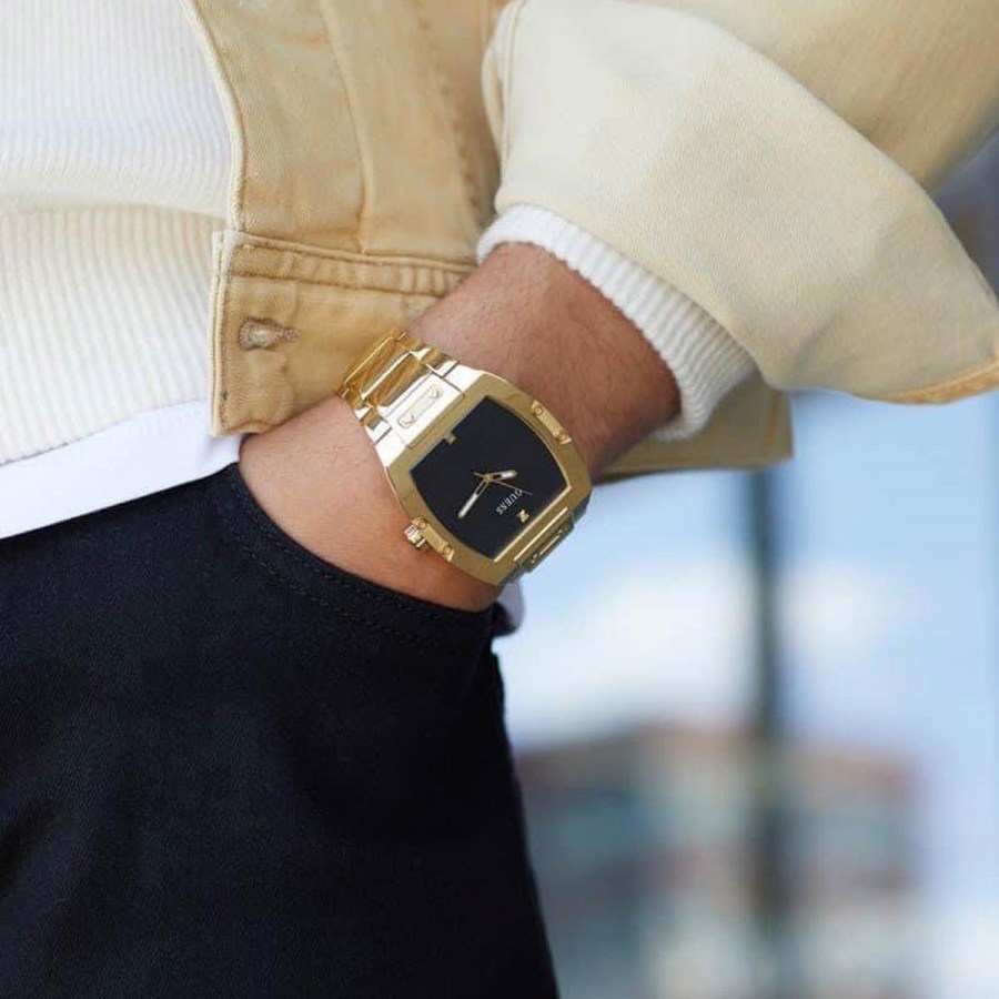 ساعت مچی مردانه نگین دار کلاسیک بند فلزی ، با ترکیب رنگ طلایی و مشکی - مناسب مجالس رسمی و فعالیت های روزمره