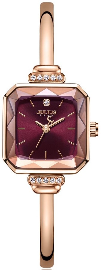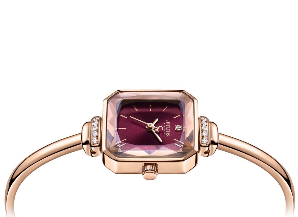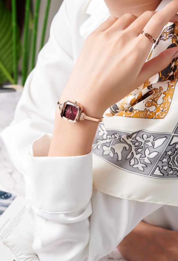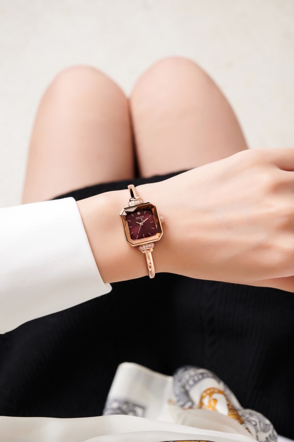 ساعت مچی زنانه نگین دار کلاسیک بند فلزی ، با ترکیب رنگ رزگلد و زرشکی - مناسب مجالس رسمی و فعالیت های روزمره