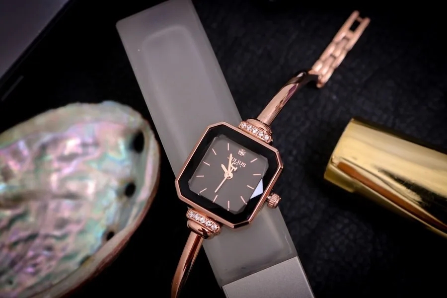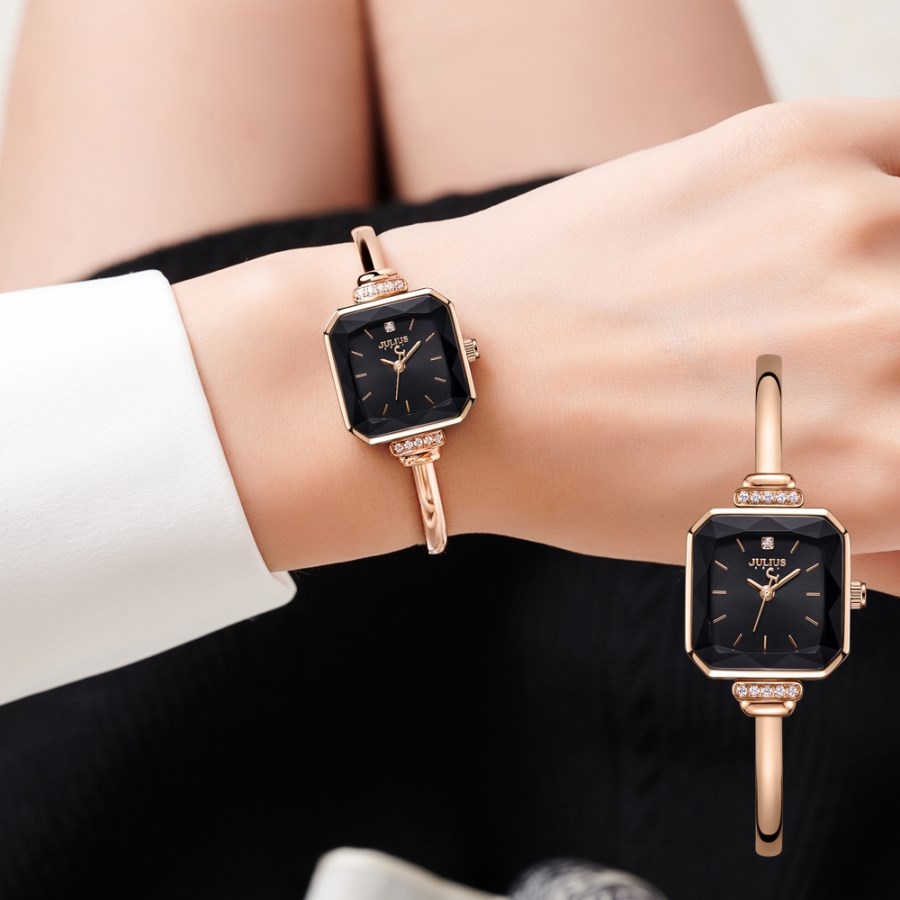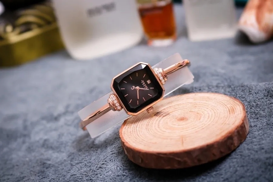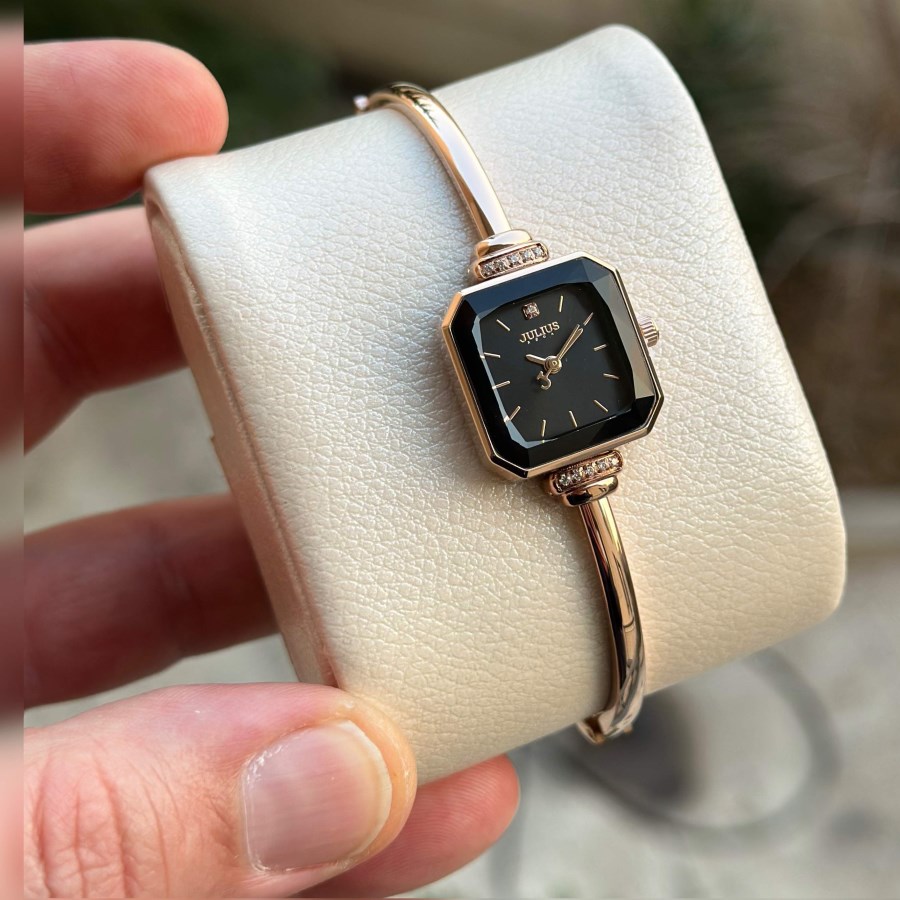 ساعت مچی زنانه نگین دار کلاسیک بند فلزی ، با ترکیب رنگ رزگلد و مشکی - مناسب مجالس رسمی و فعالیت های روزمره