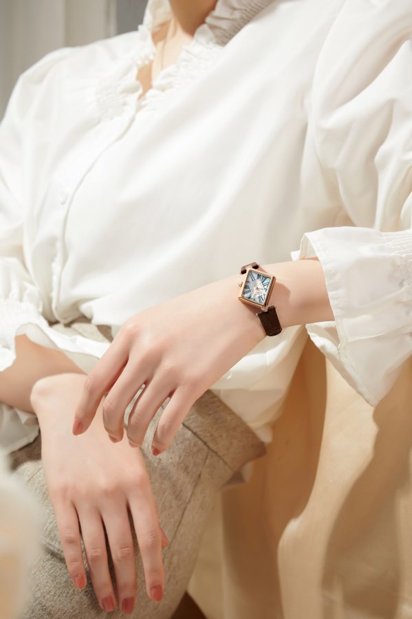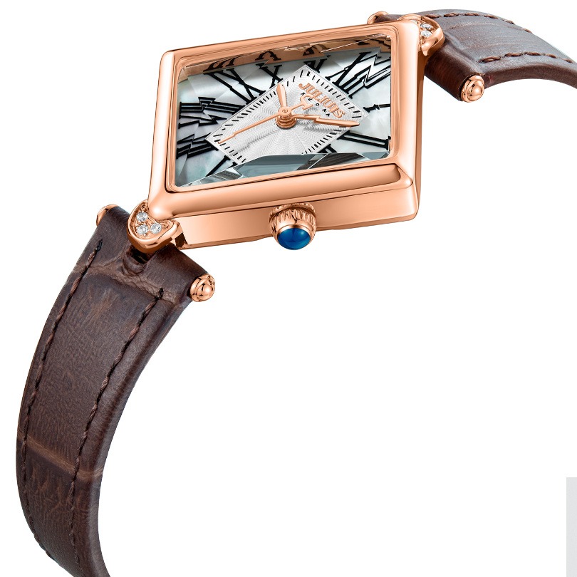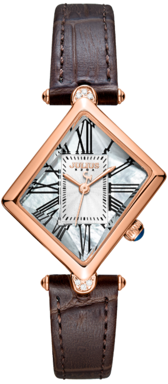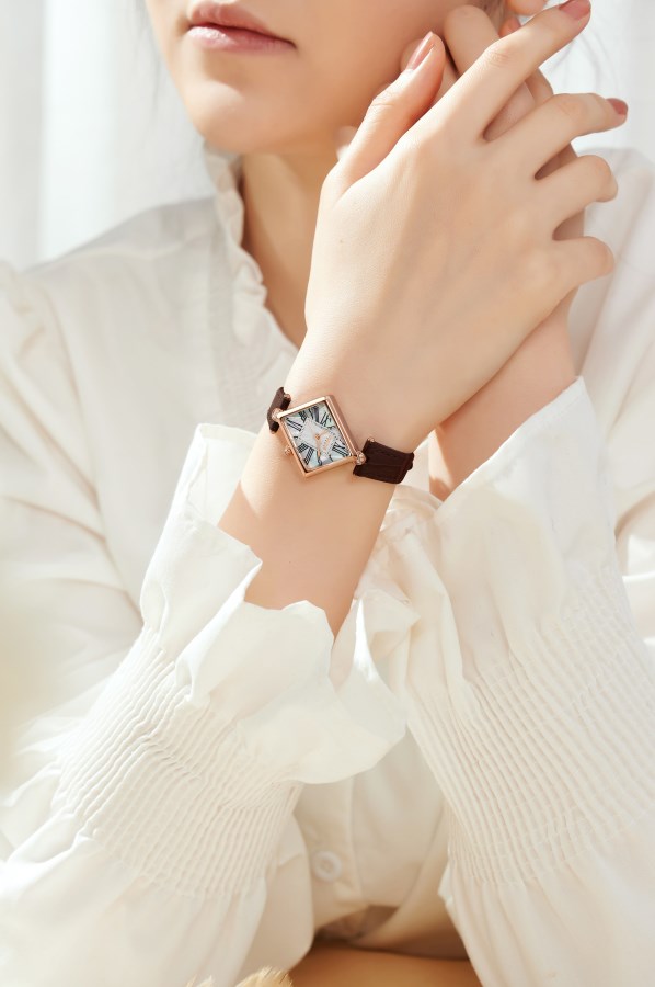 ساعت مچی زنانه نگین دار کلاسیک بند چرمی ، با ترکیب رنگ قهوهای،رزگلد و سفید - مناسب مجالس رسمی و فعالیت های روزمره