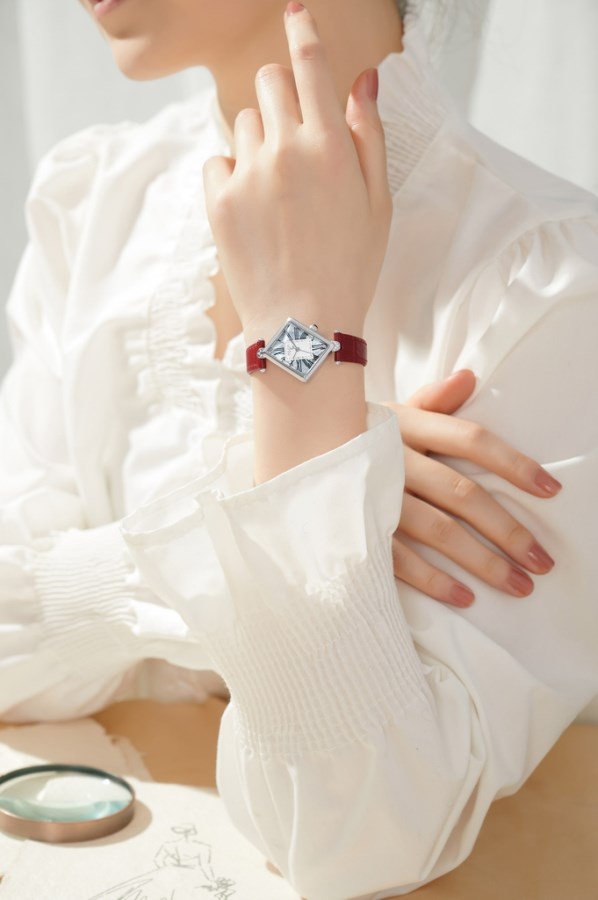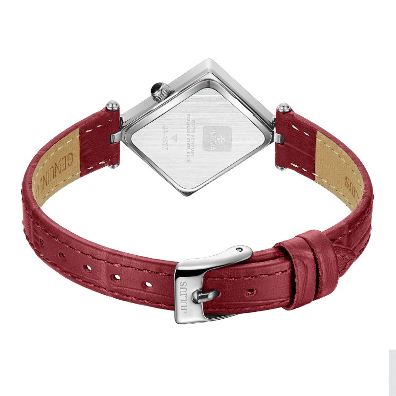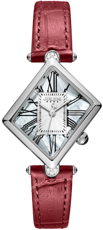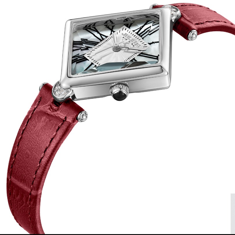 ساعت مچی زنانه نگین دار کلاسیک بند چرمی ، با ترکیب رنگ زرشکی و نقره ای - مناسب مجالس رسمی و فعالیت های روزمره