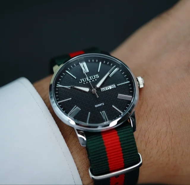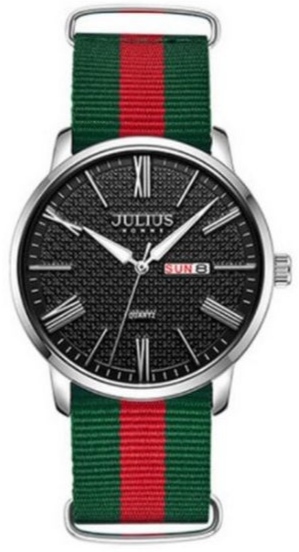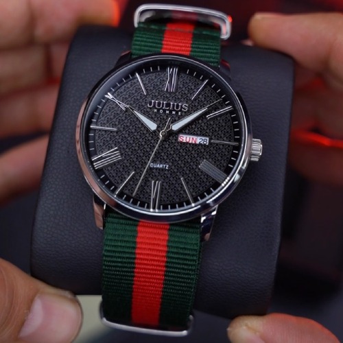 ساعت مچی اسپرت مناسب برای خانم ها و آقایان بند برزنتی (پارچه ای) ، با ترکیب رنگ سبز،قرمز و مشکی - مناسب فعالیت های ورزشی