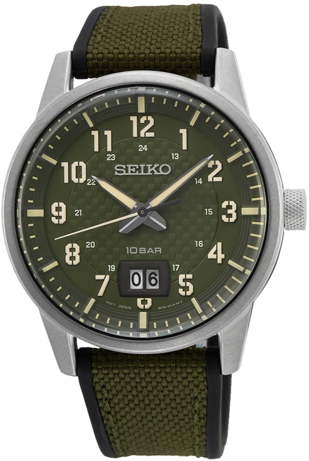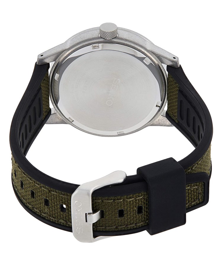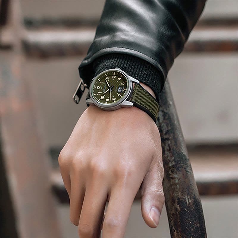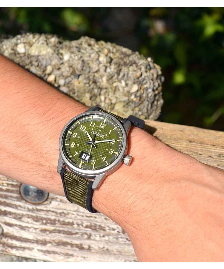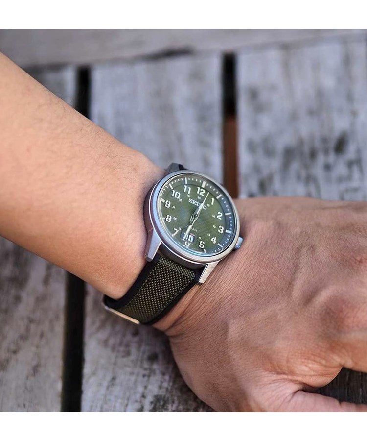 ساعت مچی مردانه اسپرت بند پلاستیکی با روکش برزنت ، با ترکیب رنگ سبز و نقره ای - مناسب فعالیت های ورزشی