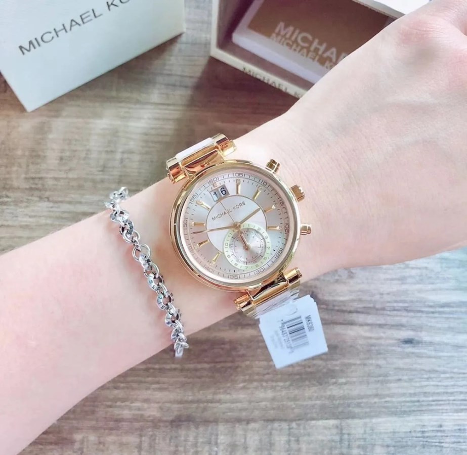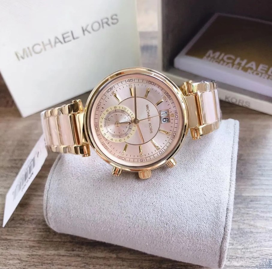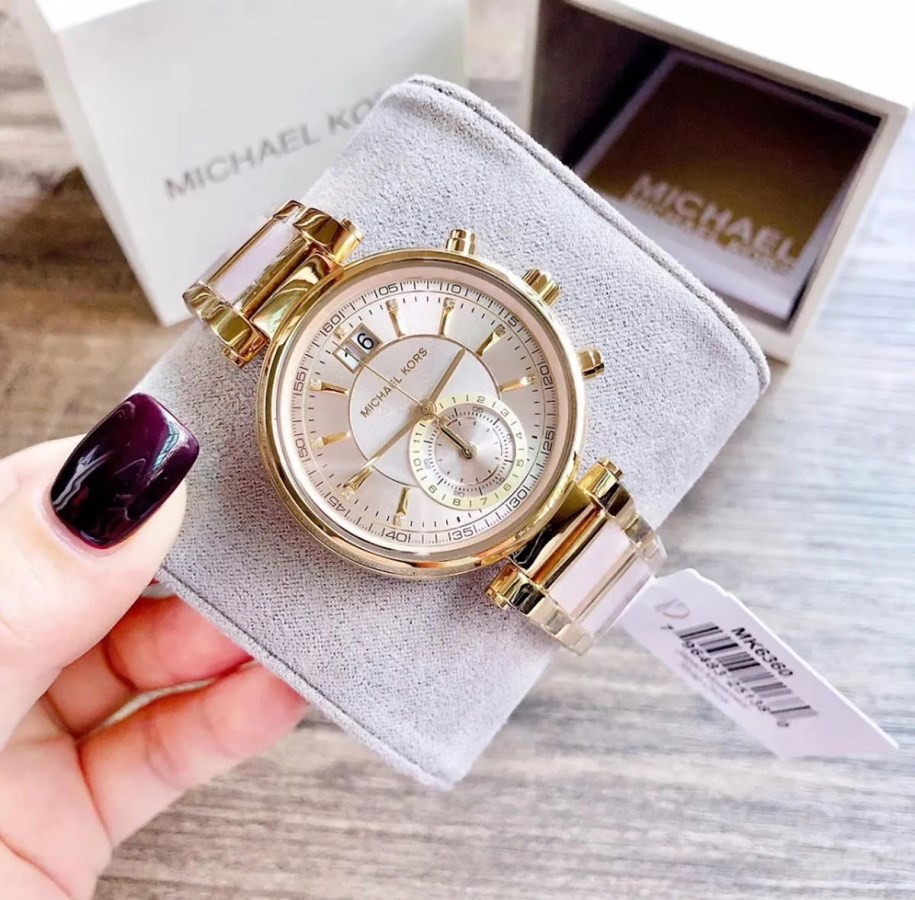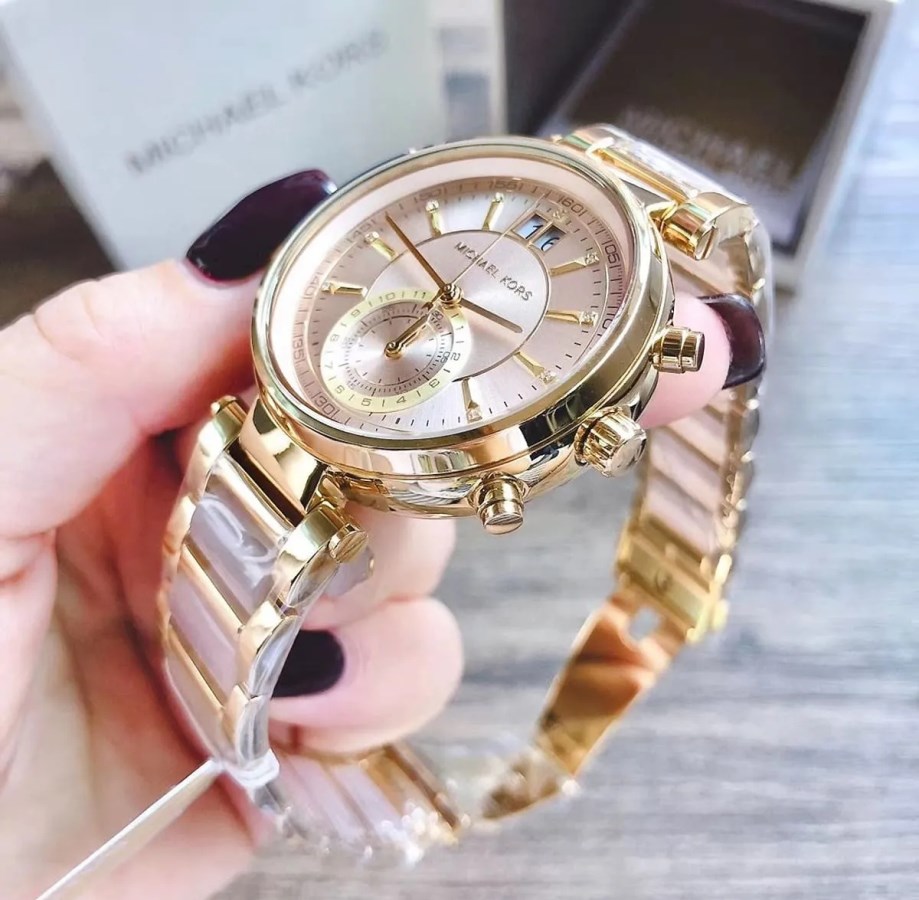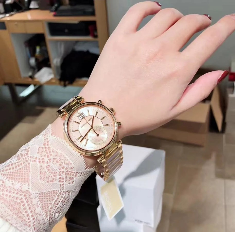 ساعت مچی زنانه کلاسیک بند استیل و رزین، نگین دار، باترکیب رنگ: طلایی - صورتی